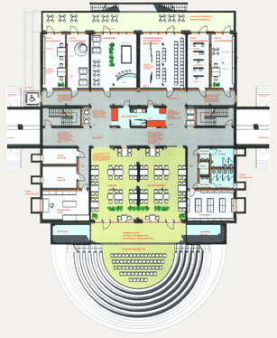 (Theater-Workshop, Cafeteria, Werkstätten, Probreräume).